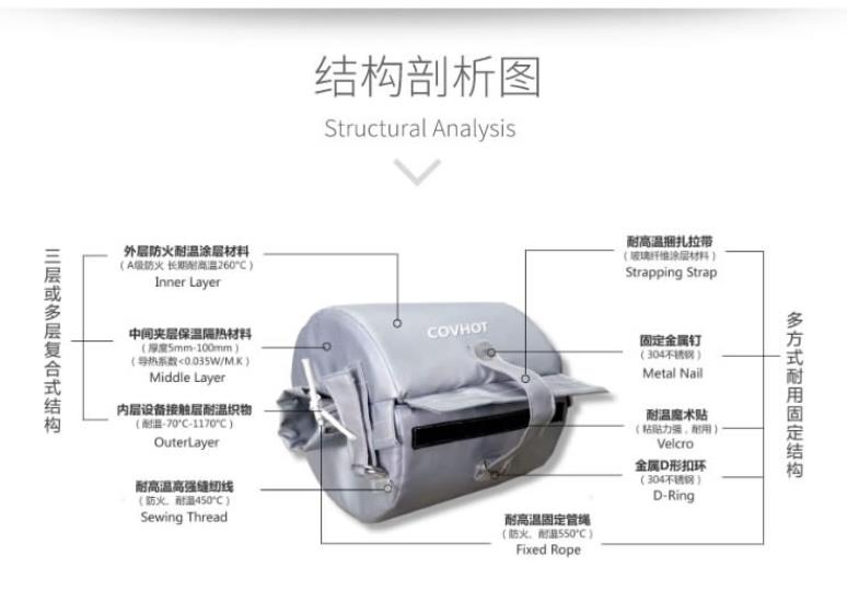 中間層為保溫棉填充層,起保溫隔熱的作用。根據(jù)不同的使用場景,一般選擇導(dǎo)熱系數(shù)低,憎水性好的保溫材料。在特定情況下,我們也會(huì)使用多種填充材料相結(jié)合的方案來確保我們的保溫套(衣)符合設(shè)備的需求。