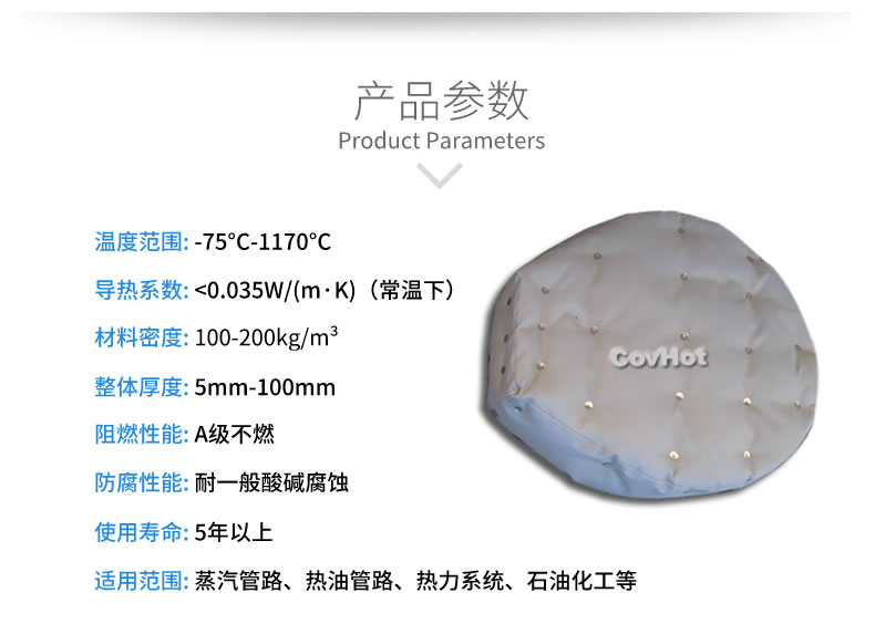 柔性可拆卸人孔保溫隔熱套可以很好的解決以上問題,產品耐高溫可達550℃,保溫隔熱效果好,可以很方便的進行人孔設備拆裝,方便清洗和維護,表面采用可擦洗材料,防水防油,耐腐蝕??梢苑磸筒鹧b使用。是工業進行人孔保溫的理想產品。